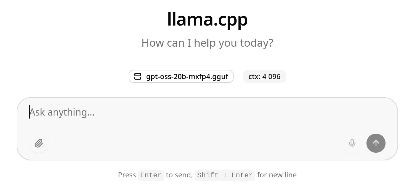 --gpus all прокидываем все видеокарты в контейнер-d запускаем в фоне-p 8000:8000 прокидываем порт 8000 из контейнера на хост, именно на этом порту мы будем запускать сервер-v "$PWD/llamacpp/models/:/models" все наши модели будут храниться внутри контейнера по пути /modelsghcr.io/ggml-org/llama.cpp:server-cuda указываем недавно скачанный образ-m /models/gpt-oss-20b-mxfp4.gguf путь к файлу модели--host 0.0.0.0 --port 8000 запускаем сервер на всех сетевых интерфейсах на порту 8000Уже сейчас можно идти в браузер запускать веб-интерфейс на http://127.0.0.1:8000 и радоваться или разочаровываться локальному инфересу.