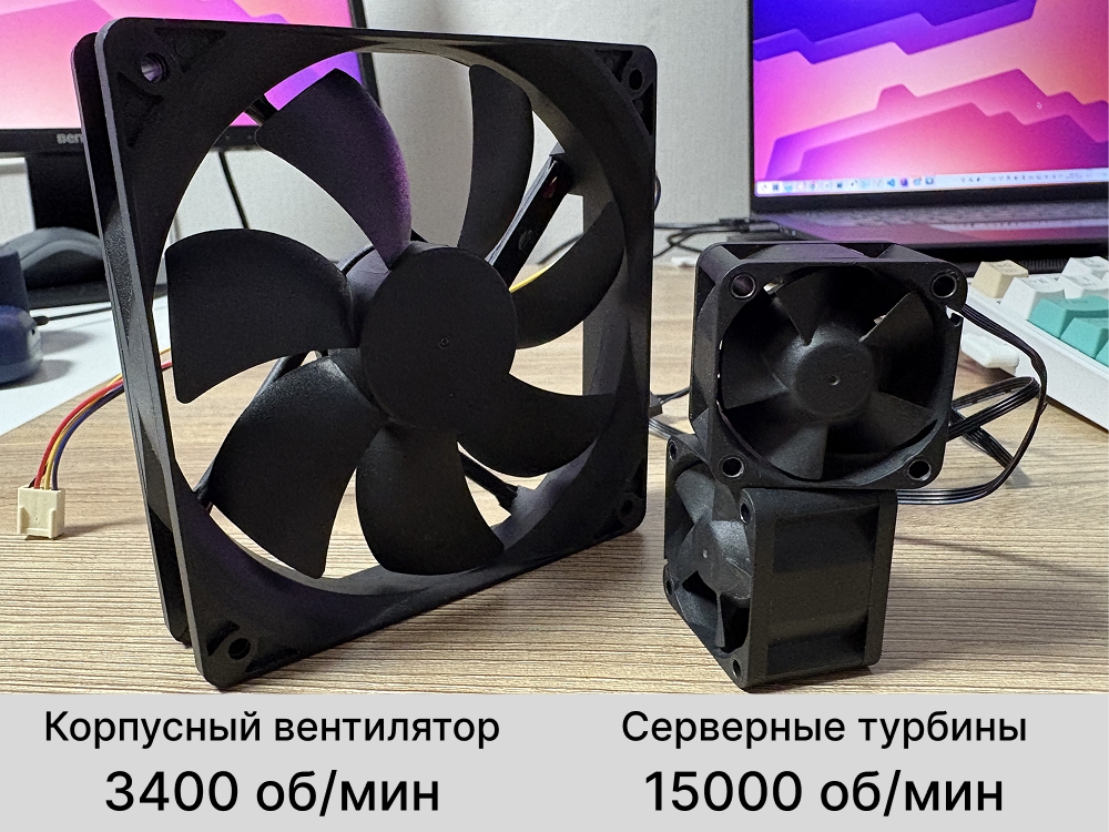 Тут мне пришлось углубиться в тему и разобраться почему же так некомфортно при этом шуме. Оказывается, все дело в типе обдува: корпусные вентиляторы и серверные турбины работают по-разному.