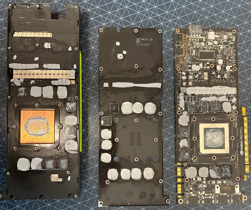 Разобрав карту я понял что термопыль термопрокладки в ней никогда не менялись, а весь вытекший из них силикон залил плату и охлаждение.