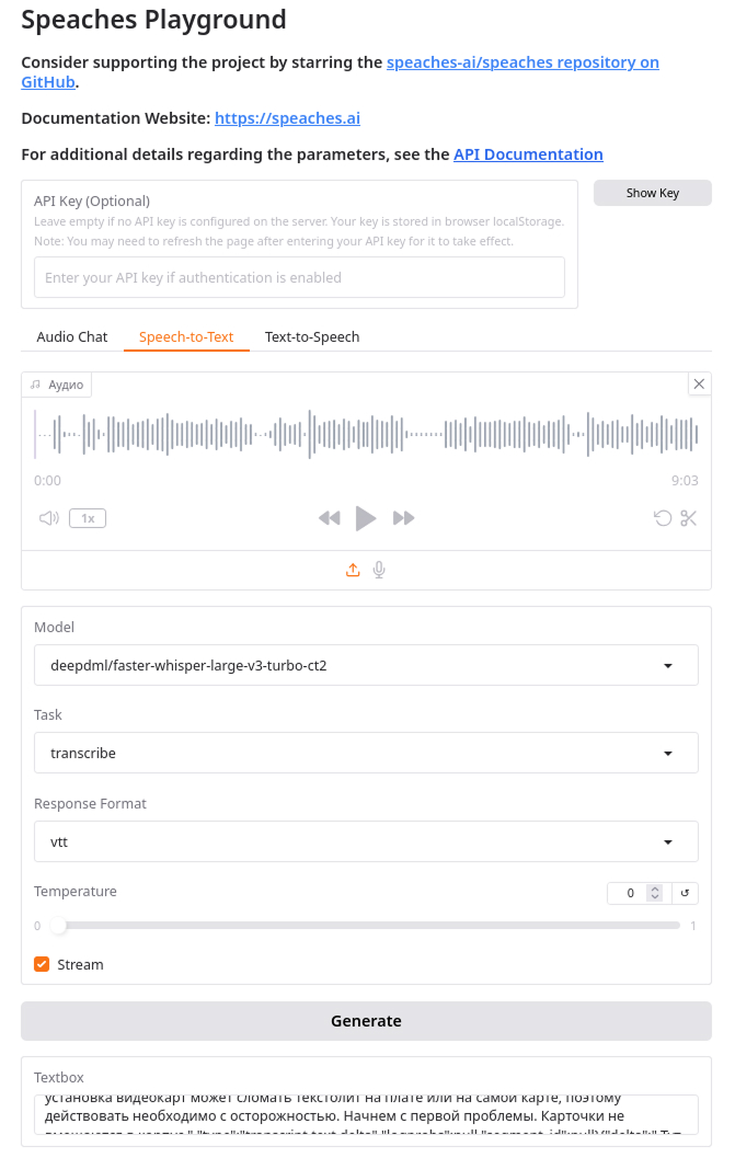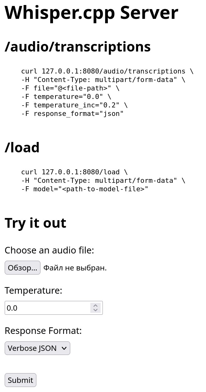 CLI, а можно запуститьweb-серверс эндпоинтом дляSTT, к тому же в режиме сервера есть web-страница с формой для отправки айдио-файла на транскрибацию.