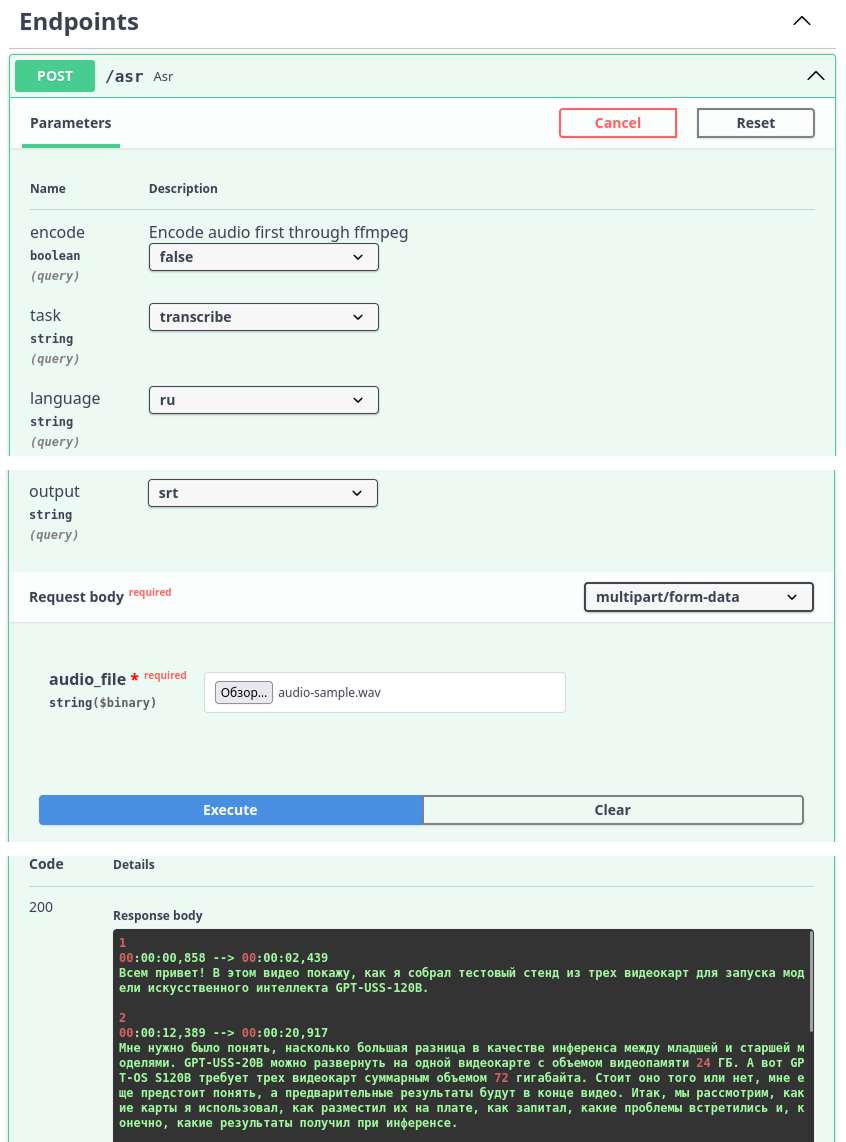 Whisper ASR Webservice - это обертка в виде API на Python, использует реализации на выбор openai/whisper, SYSTRAN/faster-whisper или whisperX. Однако, по скорости работы это оказался самый спорный проект, либо я как-то не так тестировал. Детали в самом конце.