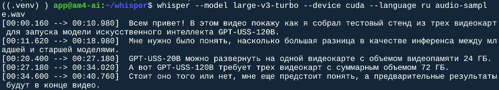 whisper --model large-v3-turbo --device cuda --language ru audio-sample.wav