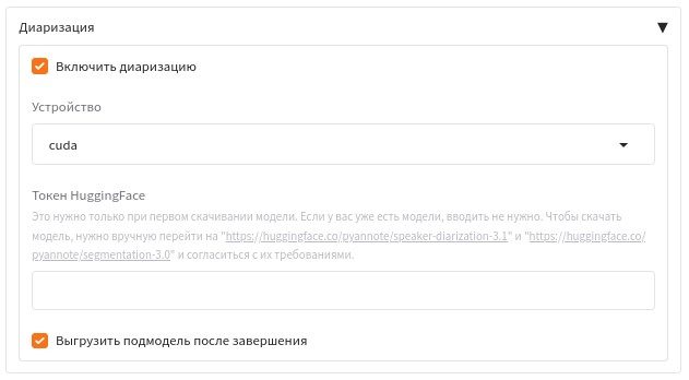 При использовании модели диаризации необходимо завести токен на HuggingFace и согласиться с требованиями на странице моделей pyannote/speaker-diarization-3.1 и pyannote/segmentation-3.0.