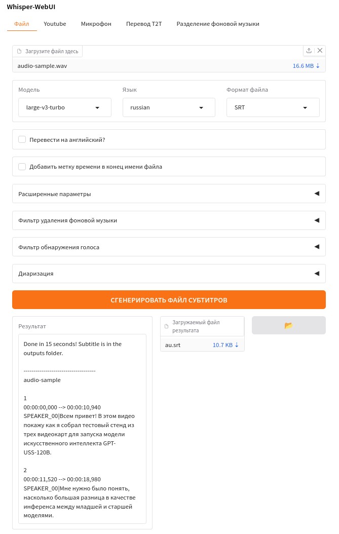 Хотя сейчас у меня на сервере развернуты все проекты, но больше всего мне понравился проект jhj0517/Whisper-WebUI. Несмотря на то что он медленнее обрабатывает файлы, у него есть качественная диаризация и потребляет относительно немного VRAM.