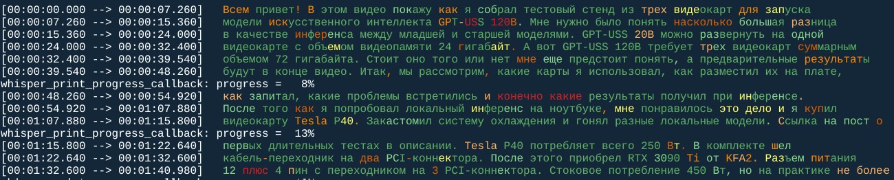 --model large-v3-turbo: указываем модель, если ее еще нет то она будет скачана--device cuda: указываем бэкэнд, в данном случае CUDA, так как все тесты были на RTX 3090--language ru: язык русскийРезультаты транскрибации будут выведены в лог: